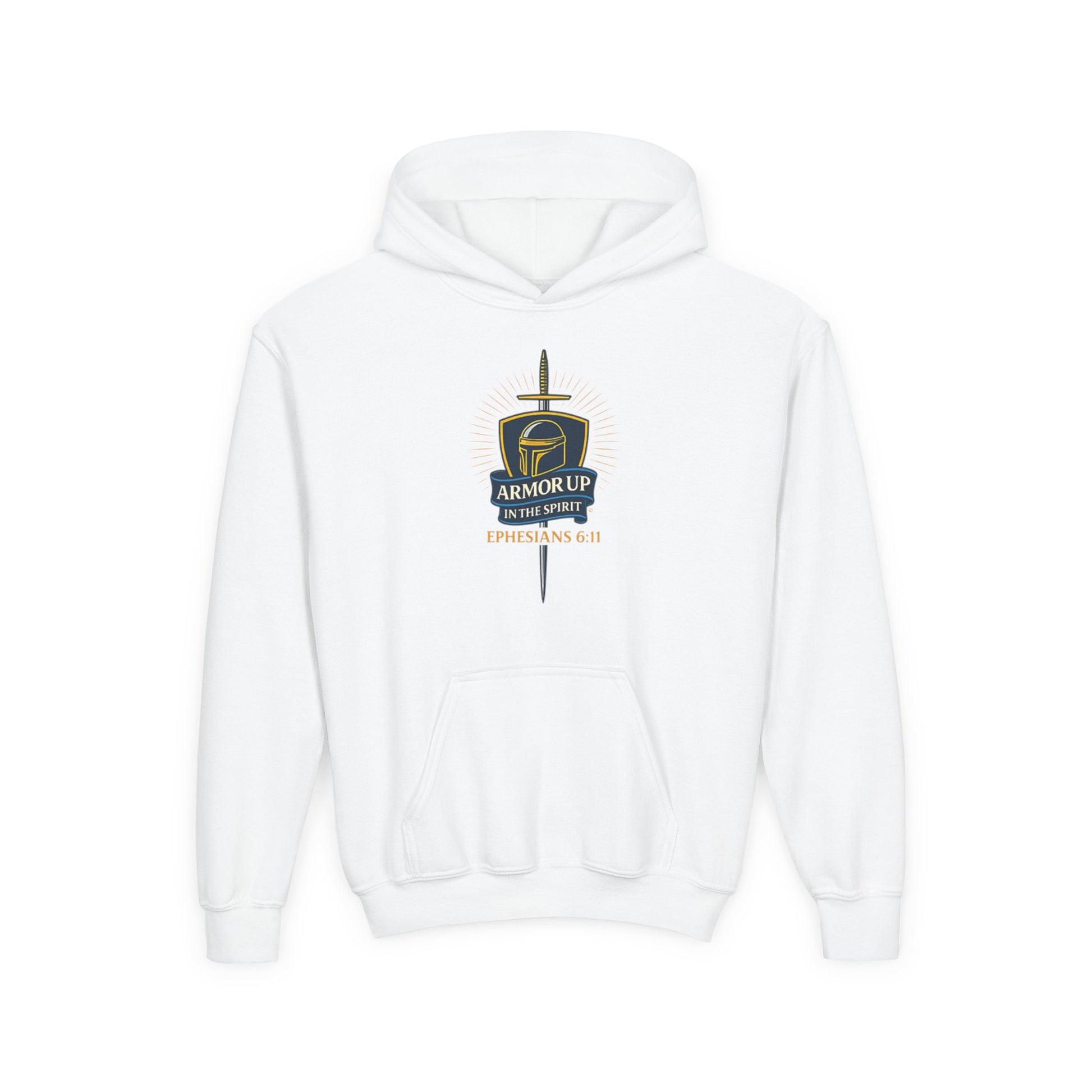 Armor Up (Blue & Gold Lettering) Youth Hooded Sweatshirt: Inspirational Shirt for Kids, Faith-Based Apparel, Gifts for Believers