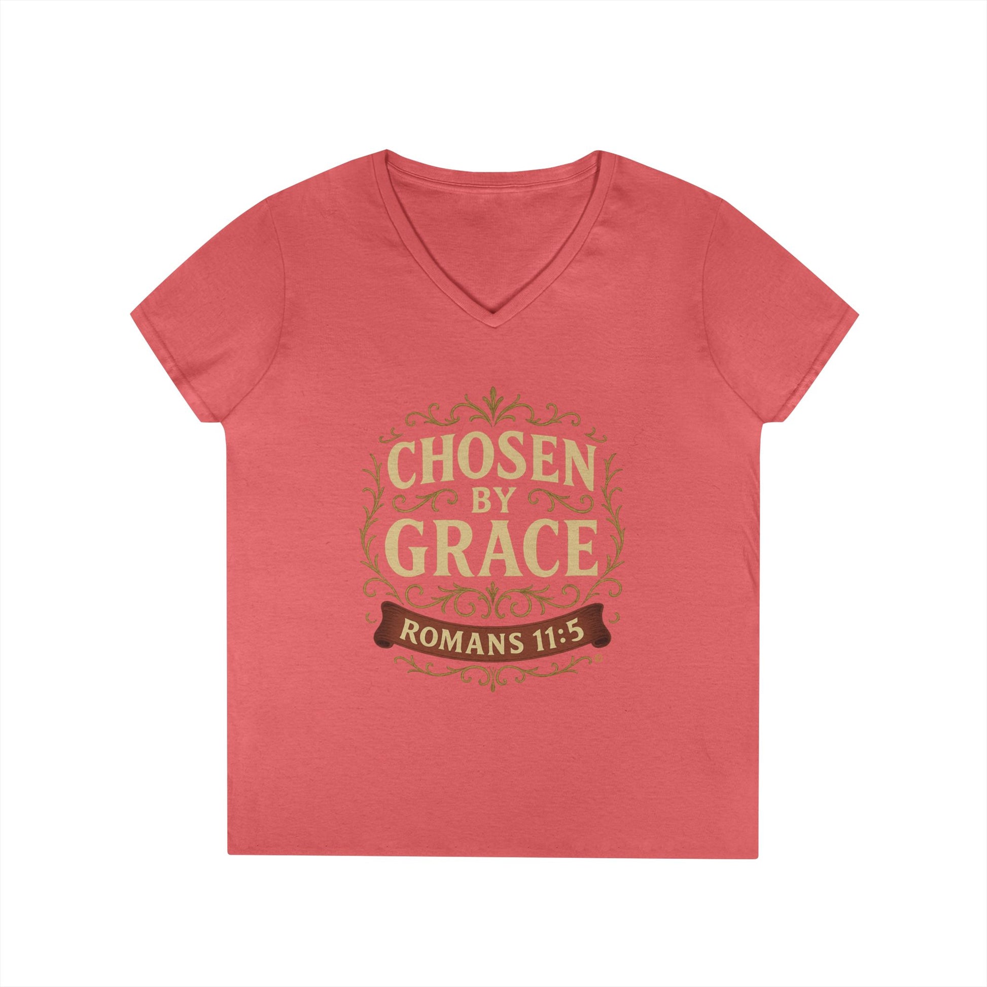 Chosen by Grace (Full Color) Ladies V-Neck T-Shirt, Inspirational Gift, Faith-Based Gift
