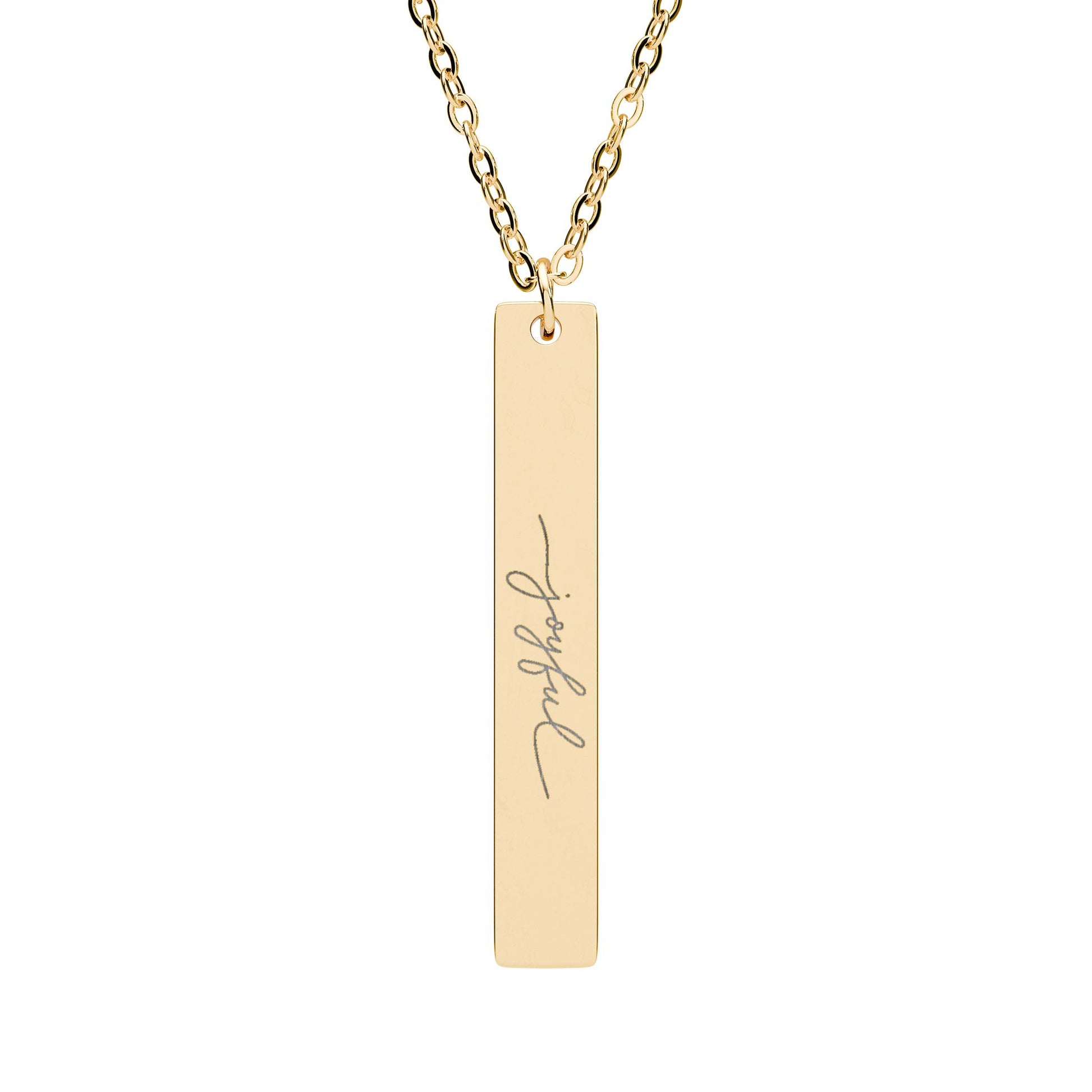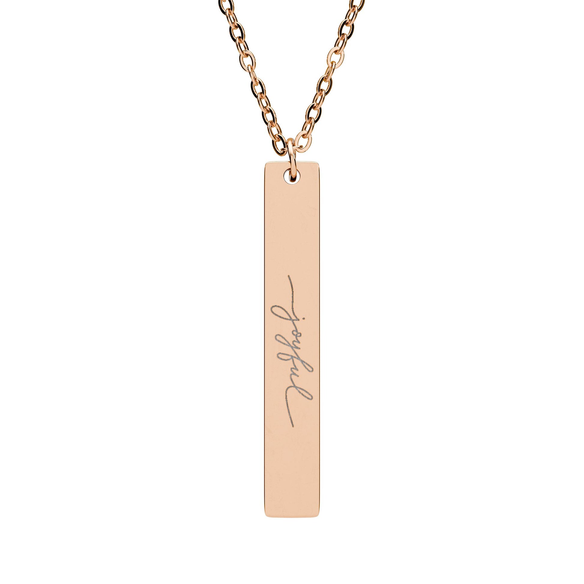 A slender, engraved bar necklace that reads like a private note against the chest. The surgical-grade stainless steel bar is polished for a subtle shine and laser-etched with a delicate script flourish that won’t wear away. Lightweight and low-profile, it layers easily with other chains or stands alone as a simple statement. The narrow 32 x 5 mm pendant sits close to the collarbone and carries a quietly personal energy — wear it daily as a tiny reminder or give it when words feel too small.